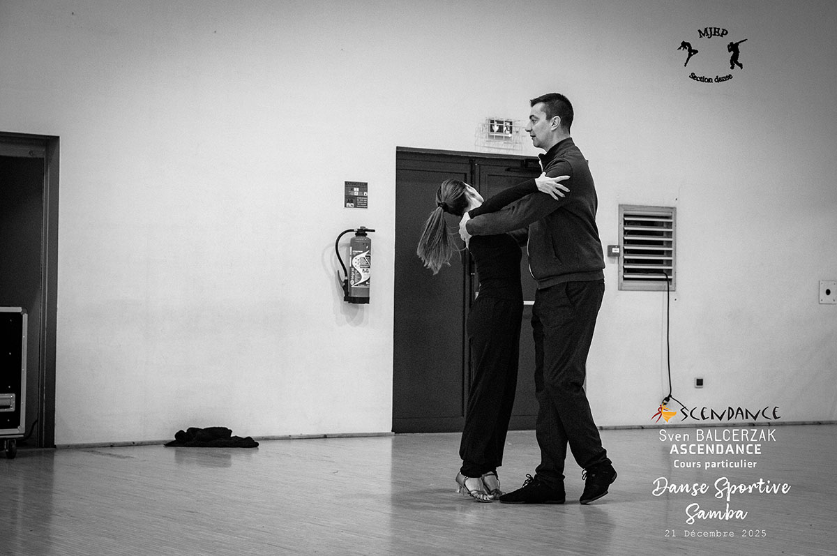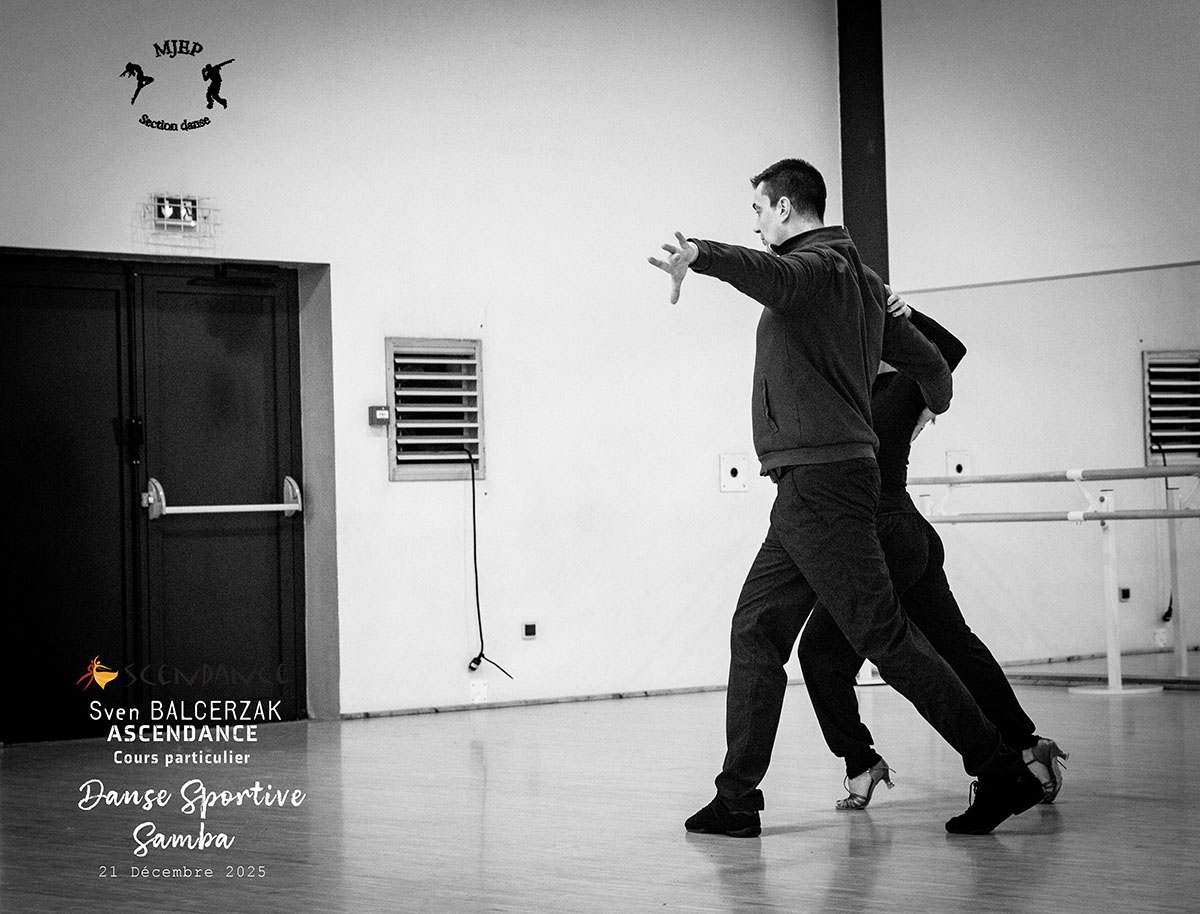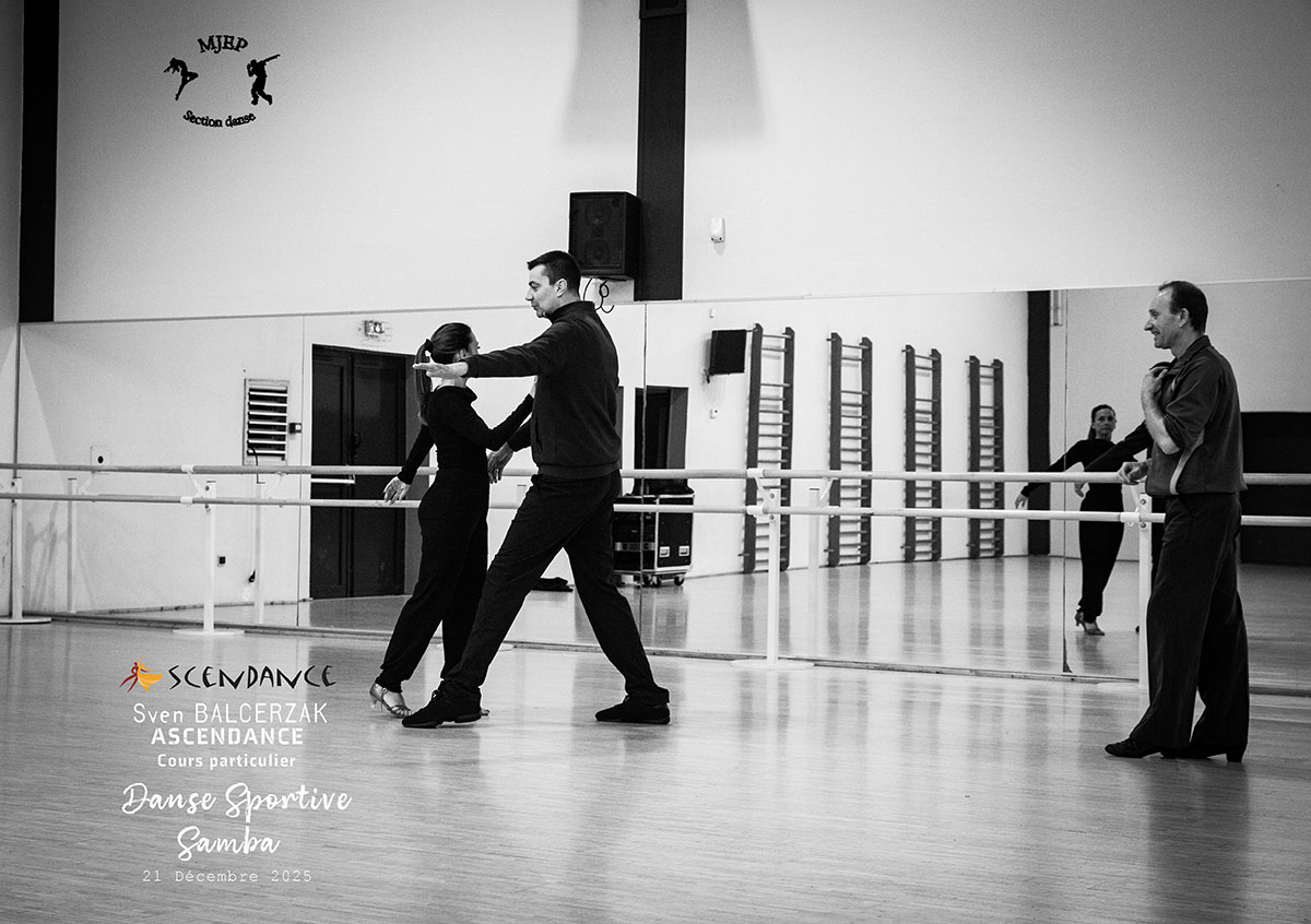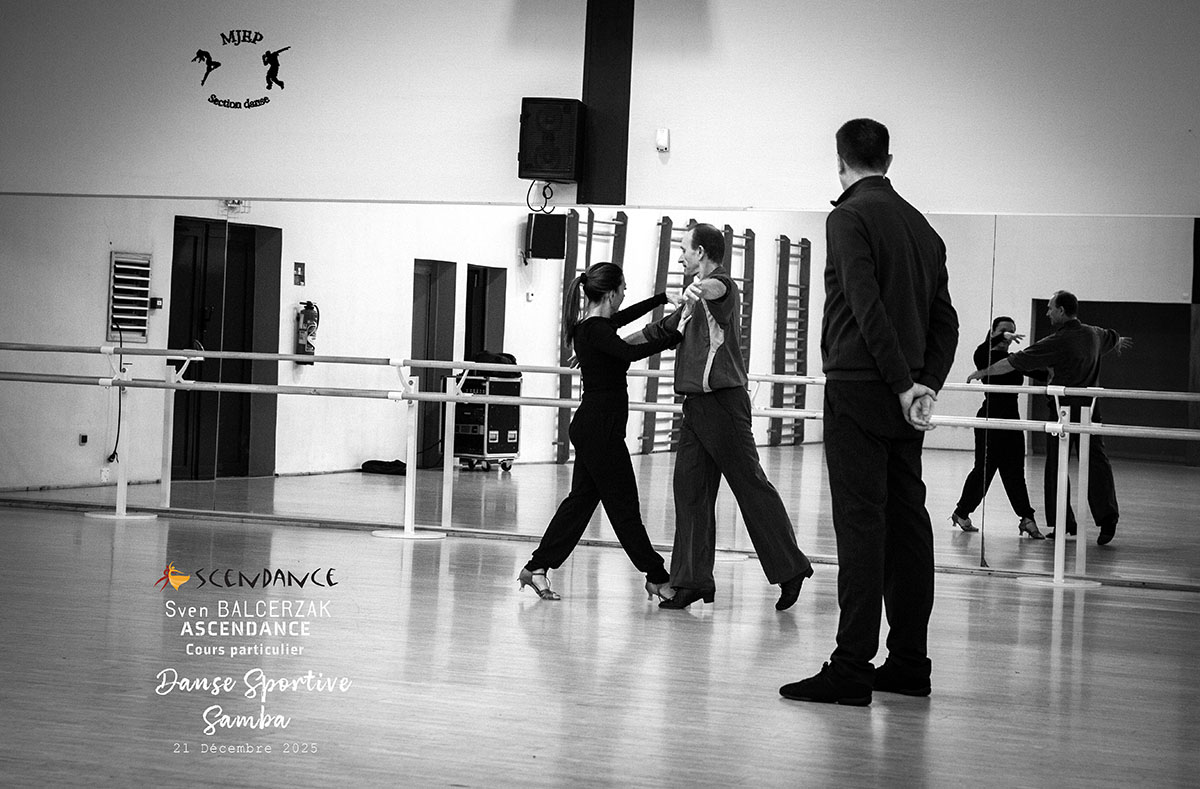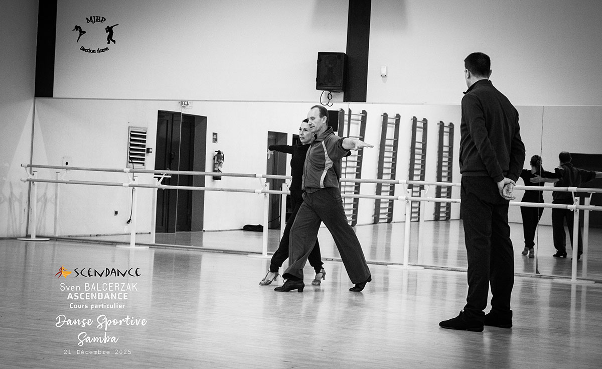 Au cours de cet entraînement, Stéphanie et Dave, danseurs et compétiteurs du club ASCENDANCE, ont approfondi plusieurs figures de la Samba. Le travail a porté notamment sur la précision des appuis, la gestion du rebond caractéristique, la coordination entre les jambes et le bassin, la stabilité posturale et la musicalité.