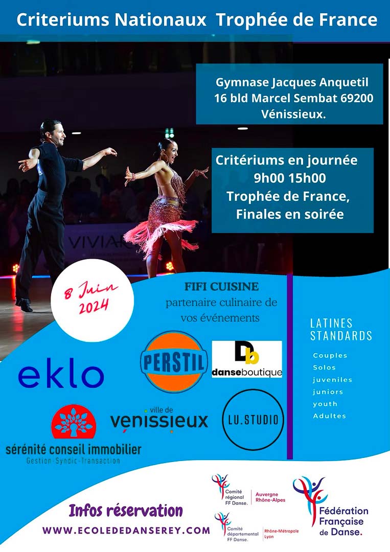 VP DANSES a participé à la compétition de Danse Sportive des CRITERIUM NATIONAUX à VENISSIEUX (France) le 09/06/2024 dans la catégorie SENIOR II Standards. Ce 16ème Trophée Vénissian est un événement de la Fédération Française de Danse (FFD).